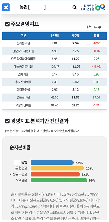 이 시스템은 구조개선업무의 디지털전환을 위해 개발된 '통합구조개선시스템(NH DREAM)'이 매월 지역 농·축협에 제공하는 경영진단보고서를 모바일환경에 맞추어 개편한 것으로 디지털접근성을 개선해 농·축협 경영관리자의 의사결정을 적시에 도울 예정이다.
