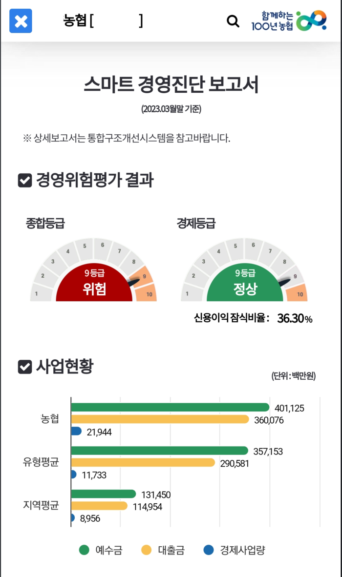 농협중앙회 조합구조개선부는 농·축협의 건전경영 및 스마트한 경영환경 조성을 지원하고자 모바일 기반 'NH With 스마트 경영진단보고서 열람시스템'을 개발했다고 30일 밝혔다.