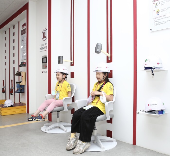 ▲LG유플러스는 6월 7일부터 8일까지 직원과 직원 가족들의 안전의식을 높이고, 일상 속 안전사고 대응능력을 강화하기 위해 ‘안전 가족캠프’를 진행했다. 사진은 직원 자녀가 대전R&D센터 내 체험관에서 안전모 체험을 하는 모습. |
