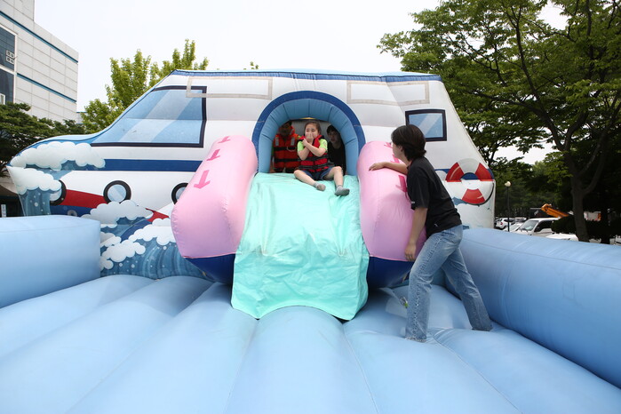 ▲LG유플러스는 6월 7일부터 8일까지 직원과 직원 가족들의 안전의식을 높이고, 일상 속 안전사고 대응능력을 강화하기 위해 ‘안전 가족캠프’를 진행했다. 사진은 직원 자녀가 대전 R&D센터에 마련된 체험장에서 사고 선박에서 탈출을 체험하는 모습. |