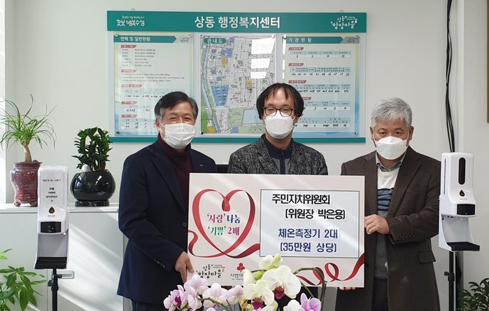 [로컬세계 박세환 기자]대구 수성구 상동 주민자치위원회(위원장 박은용)는 지난 27일 상동행정복지센터를 방문해 코로나19 예방을 위해 써달라며 손소독용 체온측정기 2대(33만원 상당)를 전달했다.