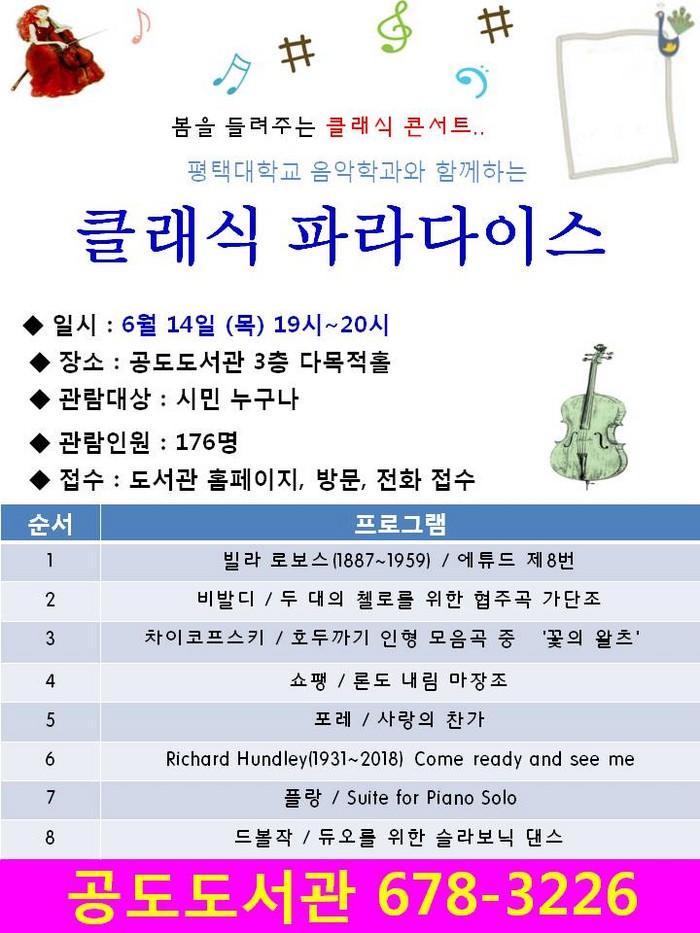 평택대학교 음악학과 학생들과 교수의 재능기부로 열리는 이번 음악회는 첼로, 클래식기타, 피아노를 연주하며 아름다운 선율과 함께 유익한 해설을 곁들여 클래식에 대한 대중의 이해를 높이고 도서관이 문화 향유의 장으로서 이용자들에게 초여름밤의 추억을 선사할 예정이다.