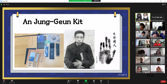 | ▲지난 14일 온라인으로 진행된 ‘수원(One)데이’ 역사골든벨 프로그램에 참여한 외국인 주민들이 독립운동가 안중근에 대해 배우고 있다. 수원시 제공 |