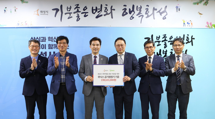 | ▲서철모 화성시장(왼쪽에서 세번째)이 윤철민 위닉스 대표(오른쪽에서 세번째)와 위닉스 공기청정기 전달식을 마치고 관계자들과 함께 기념촬영을 하고 있다.(화성시 제공) |