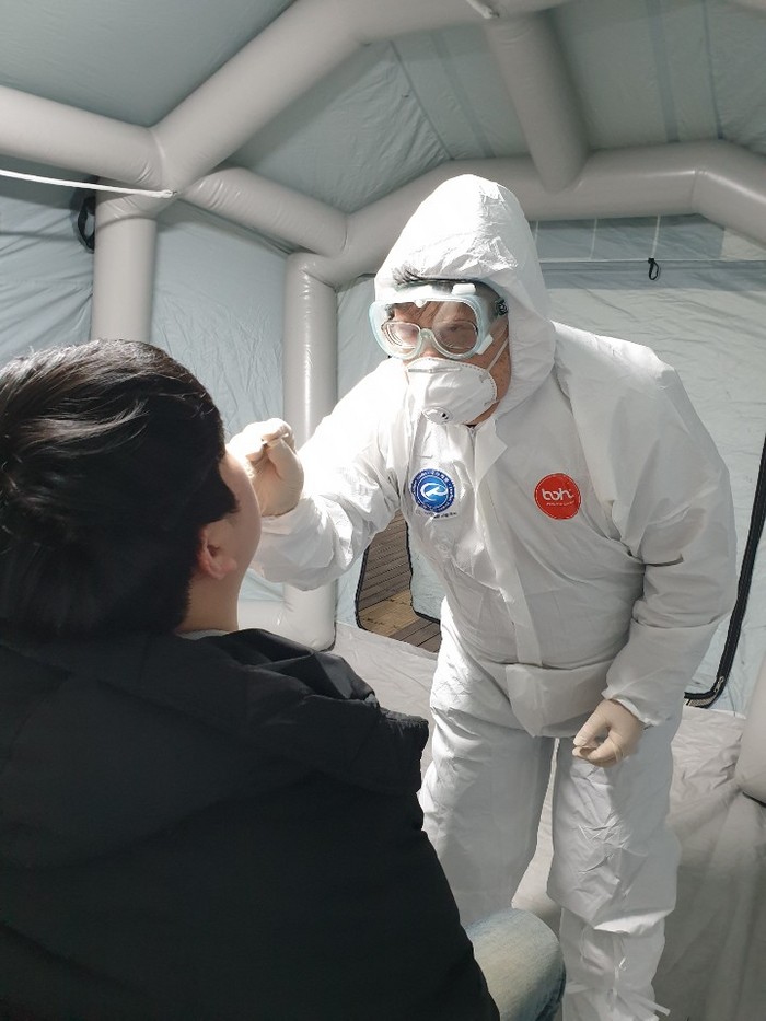 | ▲보건소 의료진이 코로나19 검사를 위해 검체를 채취하고 있다. 용인시 제공 |