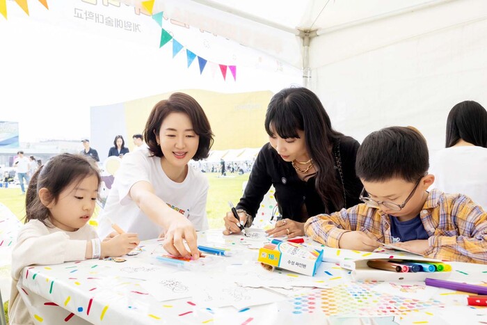 ▲지난 4일 인천 영종도 파라다이스시티에서 열린 ‘제14회 아이소리축제’에서 최윤정 파라다이스복지재단 이사장, 오윤아 파라다이스복지재단 이사와 행사에 참가한 어린이들이 초대형 협동화를 완성하기 위한 그림 조각을 함께 그리고 있다. |