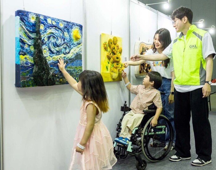 ▲지난 4일 인천 영종도 파라다이스시티에서 열린 ‘제14회 아이소리축제’에 참가한 아이들이 파라다이스 및 GKL 임직원 봉사단과 함께 촉각을 활용해 명화를 감상하고 있다. |