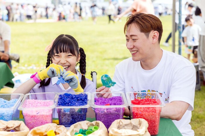 ▲지난 4일 인천 영종도 파라다이스시티에서 개최한 ‘제14회 아이소리축제’ 체험 부스에서 행사에 참가한 어린이와 파라다이스 직원이 함께 업사이클링 키링을 만들고 있다. |