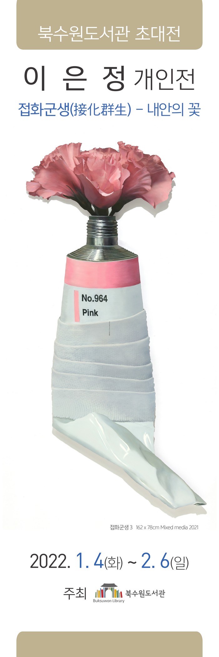 [로컬세계 김병민 기자]경기 수원시 북수원도서관이 4일부터 2월 6일까지 도서관 1층 갤러리에서 수원시 예술인 이은정 작가 초대전 ‘접화군생(接化群生) - 내 안의 꽃’을 개최한다.