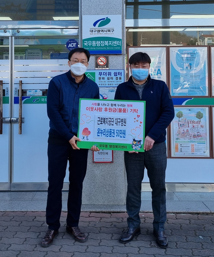 [로컬세계 박세환 기자]대구 북구 학정동에 위치한 근로복지공단 대구병원(병원장 정희)은 지난 27일 설 명절을 맞이하여 관내 어려운 이웃에게 전달해 달라며 '사랑나눔 후원금' 온누리상품권 50만원을 기탁했다.