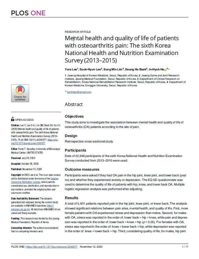 ▲ 「Mental Health and Quality of Life of Patients with Osteoarthritis Pain: The Sixth Korea National Health and Nutrition Examination Survey (2013–2015)」 |