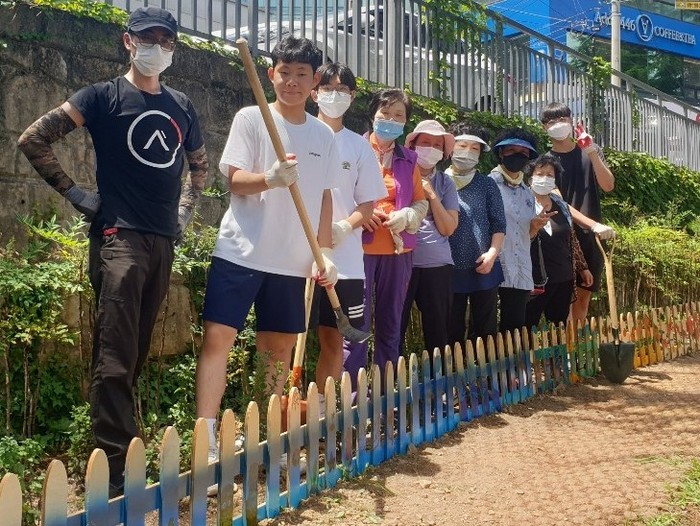 또 울타리 설치 작업 외에도 풀 뽑기, 물주기 등 아이들과 함께 꽃밭 가꾸기와 주변 취약지 청소 등의 봉사활동을 통해 주변 환경 경관을 개선하고 있다.