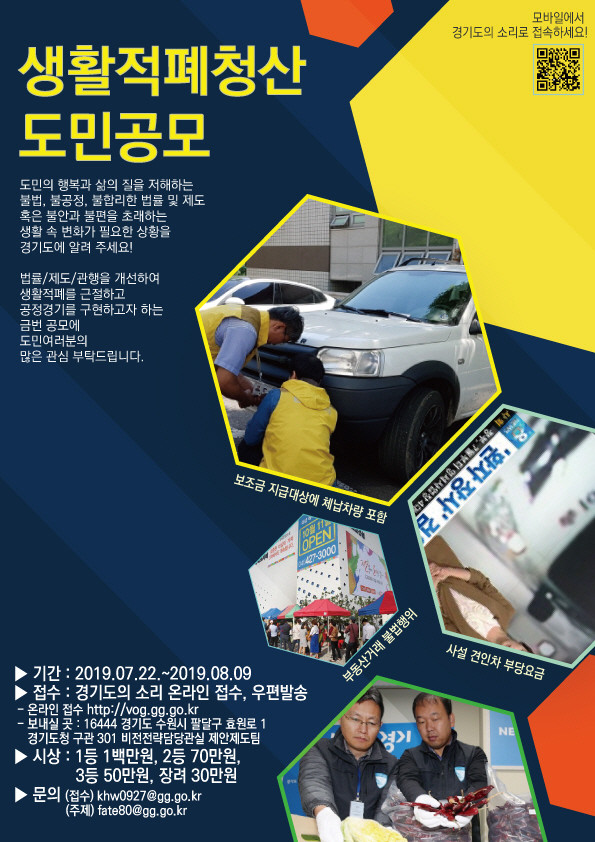 생활적폐 청산을 위한 아이디어가 있는 도민과 시민단체 등 경기도는 물론 지역에 상관없이 누구나 참여할 수 있으며, 접수는 경기도의 소리 홈페이지(https://vog.gg.go.kr/)에서 가능하다.