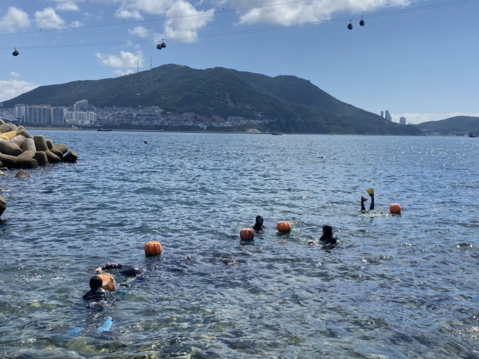 ▲기장군 해조류육종 융합연구센터에서 자체 생산에 성공한 해삼종자를 해녀들이 기장 연안 마을어장에 방류하고 있다. |