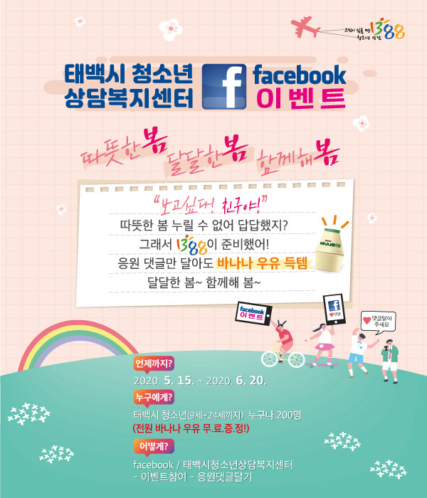 페이스북(https://www.facebook.com/태백시청소년상담복지센터-100276078344649/)에서 청소년을 위한 응원 댓글을 남기거나 친구추천 및 공유를 하면 바나나우유 모바일쿠폰을 증정한다.