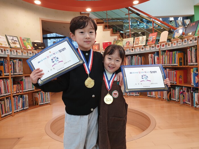 | ▲ 어린이도서관 세천책 28호, 29호 달성자 윤이원(좌), 윤이나(우) 어린이 |