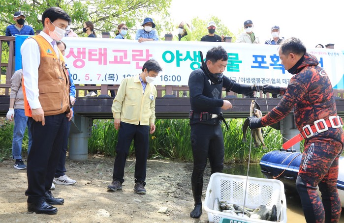 [로컬세계 박세환 기자]대구 달서구는 지난 7일 월광수변공원 내 도원지에서 야생생물관리협회 대구·경북지부와 합동으로 생태교란 어종인 배스, 블루길 포획행사를 가졌다고 8일 밝혔다.