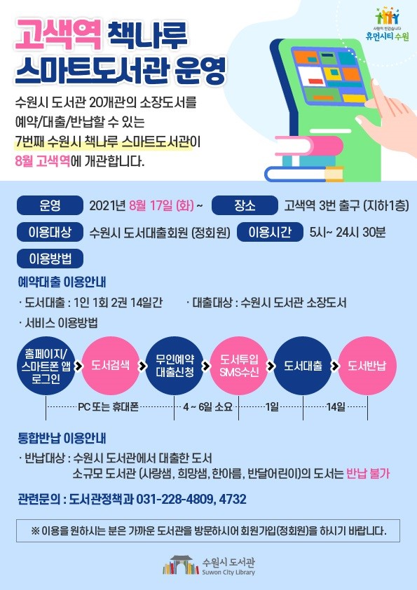 수원시 도서관 관계자는 “고색역 책나루 스마트도서관 개관으로 서수원지역 주민들이 한결 편리하게 도서를 대출하고 반납할 수 있을 것”이라며 “시민들의 도서관 이용 만족도가 더 높아지길 바란다”고 말했다.