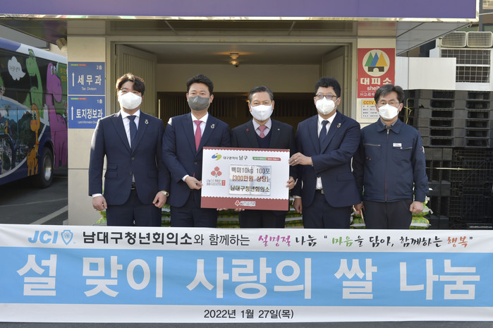[로컬세계 박세환 기자]대구 남구청(구청장 조재구)은 지난 27일, 남대구청년회의소(회장 김덕현)에서 설을 맞이하여 어려운 이웃을 위해 백미 100포(300만원 상당)를 기탁했다고 밝혔다.