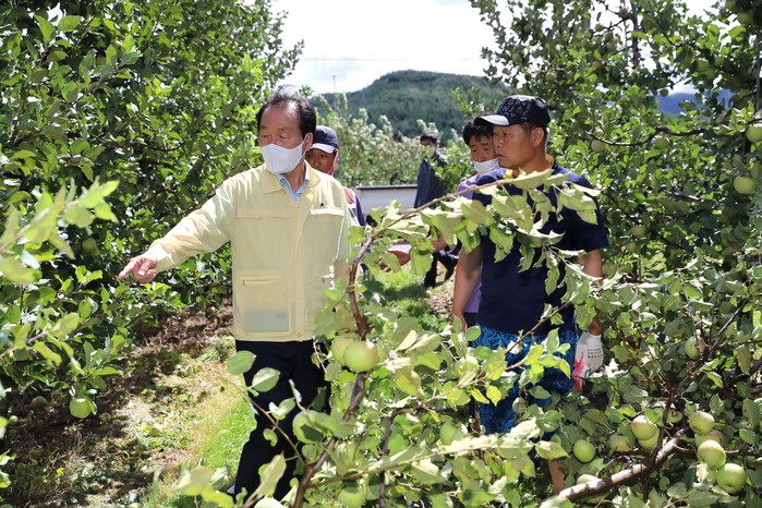 | ▲김주수 군수가 지난 7일 한 사과재배농가를 방문해 탄저병 상황을 점검하고 있다.(의성군 제공) |
