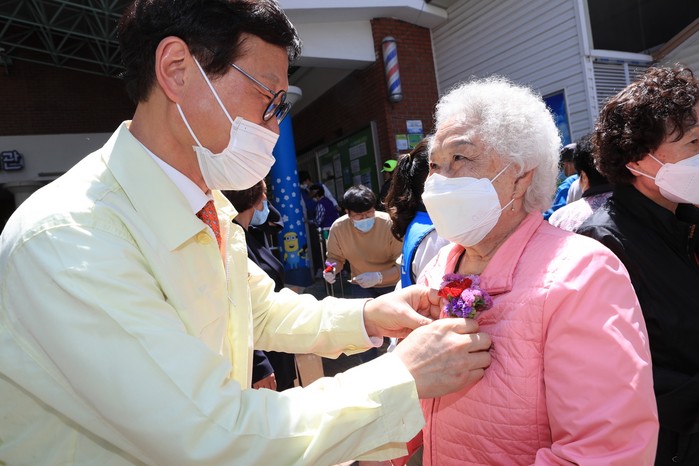 [로컬세계 박세환 기자]김대권 대구 수성구청장이 8일 어버이날을 맞아 지산종합사회복지관을 방문한 어르신에게 카네이션을 달아드리고 있다. 김 구청장은 이날 어버이날을 맞아 지역 내 복지관을 방문해 어르신들에게 카네이션을 달아드리고, 대체식과 선물키트를 전달했다.(사진=수성구 제공)