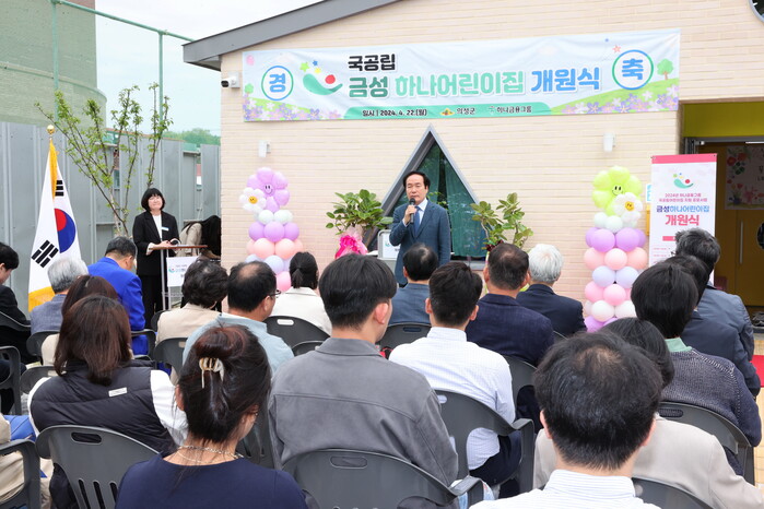 ▲ 김주수 군수가 국공립 금성하나어린이집 개원식에서 기념사를 하고 있다. 의성군 제공 |