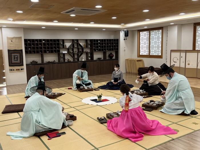 이날 체험에는 아시아척추학술대회 참가자 6명이 참여했다. 참가자들은 모명재 한국전통문화체험관 1층 다례‧명상 체험실에서 한복 입는 방법, 공수자세로 절하는 방법 등 우리나라 예절을 익히고 전통 다례 체험을 했다.