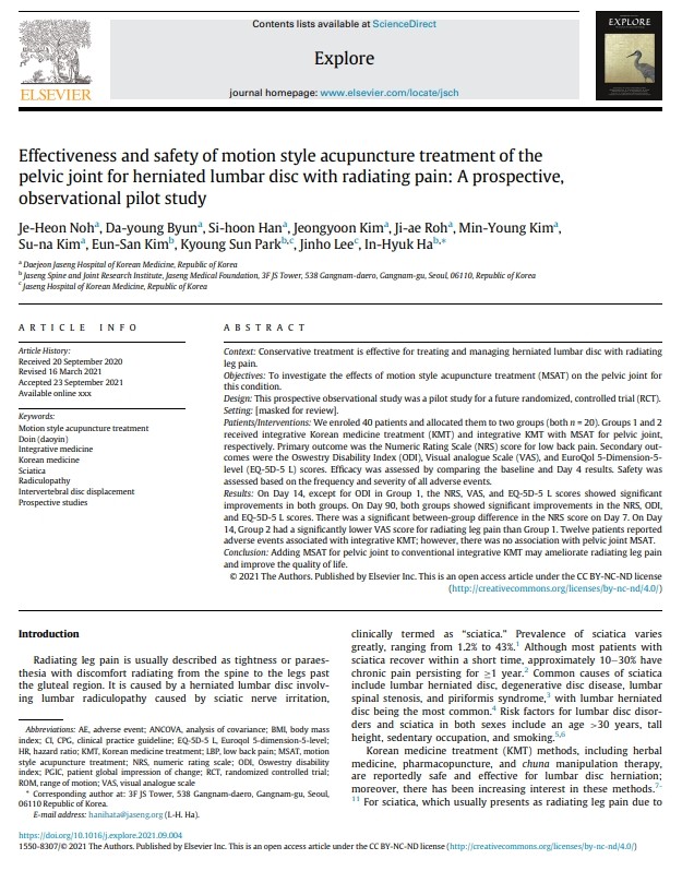 ▲‘Explore’ 2021년 10월호에 게재된 해당 연구논문「The effectiveness and safety of motion style acupuncture treatment on pelvic joint for herniated lumbar disc with radiating pain: A prospective, observational, pilot study」 |