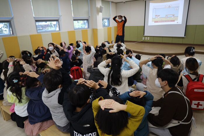 몇몇의 아이들은 안전한 장소로 대피했음에도 손으로 머리를 감싸며 사전에 받은 안전교육을 확실히 이행했다.