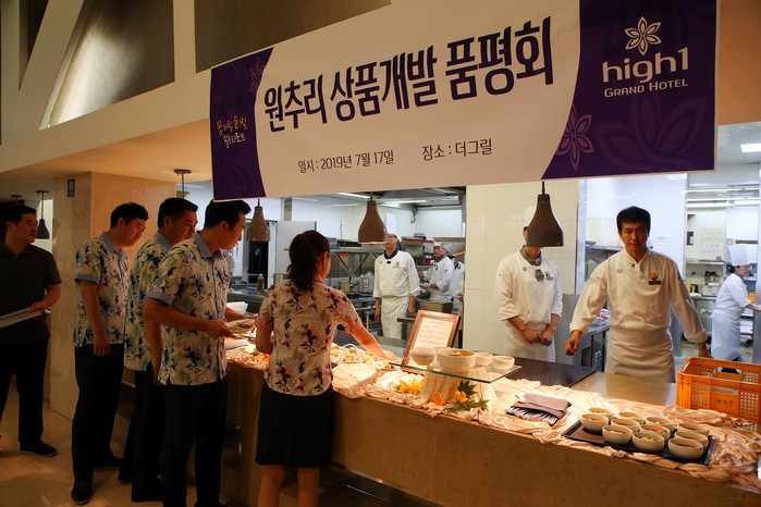 ▲하이원 리조트 직원들이 ‘원추리 메뉴 품평회’에서 메뉴 시식과 의견 교환의 시간을 가지고 있다.(하이원 제공) |