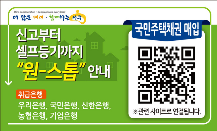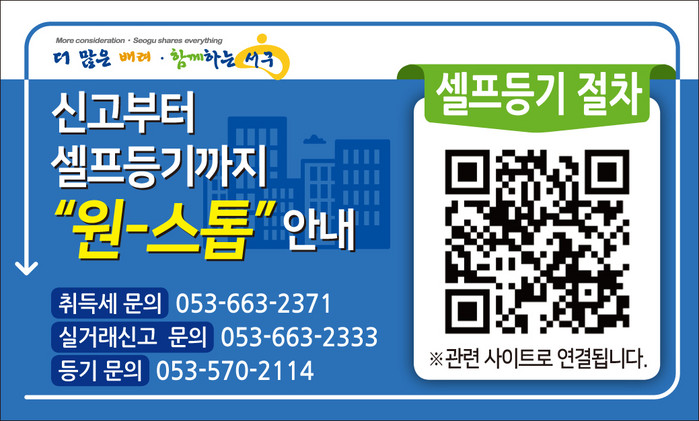 이에 서구는 취득 유형별 셀프등기 절차 및 필요서류, 담당부서를 일목요연하게 정리해 서구청 홈페이지 내 셀프등기 코너를 신설했다. 거기에 이용자의 편의를 위해 셀프등기 코너에 자주 묻는 채권매입액 계산을 도와주는 도우미 사이트를 연계해 '원-스톱 QR코드'로 제작했다.