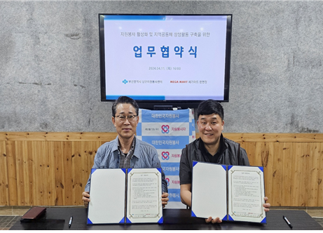 부산남구자원봉사센터와 메가마트 문현점은 4월11일 부산남구자원봉사센터 대강당에서 지역의 자원봉사 활성화 및 지역공동체 상생활동 구축을 위한 업무협약을 체결했다.