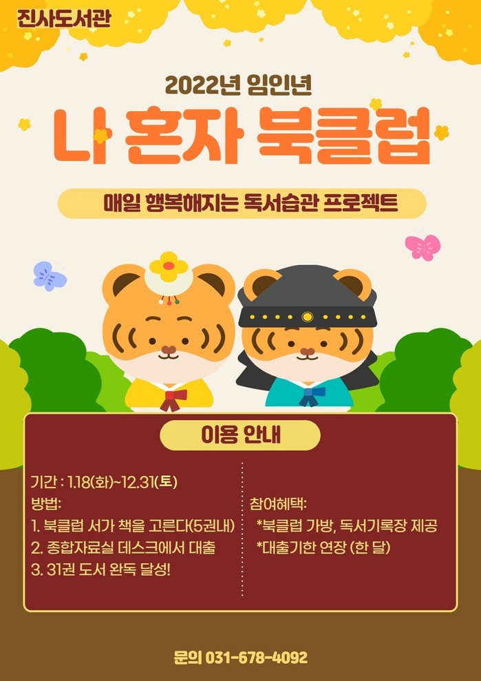 이 프로그램은 진사도서관 종합자료실에서 신청 가능하며, 기타 궁금한 사항은 전화 031-678-4092로 문의하면 된다.