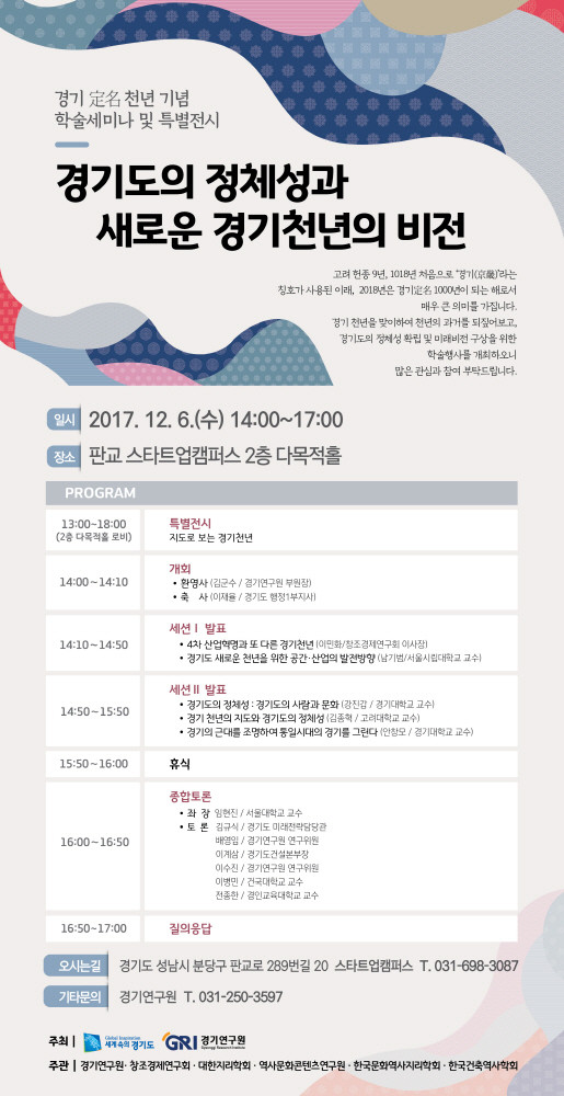 첫 번째 세션에서 이민화 창조경제연구회 이사장은 ‘4차 산업혁명과 또 다른 경기천년’을, 남기범 서울시립대 교수는 ‘경기도 새로운 천년을 위한 공간.산업의 발전방향’을 논의한다. 두 번째 세션에서는 경기도의 역사, 지도, 도시, 건축을 주제로 강진갑 경기대 교수, 김종혁 고려대 교수, 안창모 경기대 교수가 주제 발표한다.