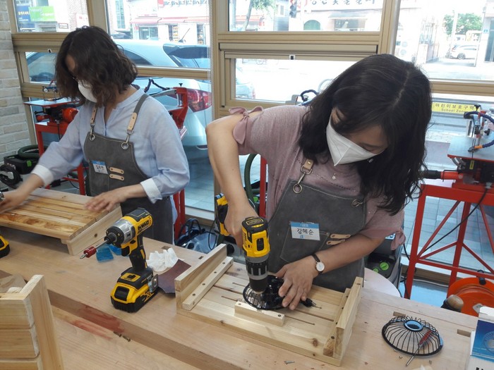 메이커교육의 이해, 학교내 메이커스페이스 구축 예, 목재가공 안전교육 방법 및 실습 순으로 진행했으며, 실습과정에서는‘통풍 발받침대’제작을 통해 메이커 활동을 경험해보고 문제를 해결해나갈 방법들을 고민해보는 시간을 가졌다.