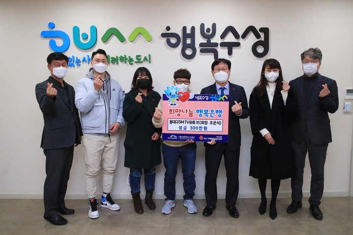 [로컬세계 박세환 기자]대구 수성구는 지난 11일 동대구3M TV 유튜브(회장 조은석)에서 주변의 어려운 이웃들을 위해 써달라며 성금 300만 원을 구에 전달했다고 12일 밝혔다.
