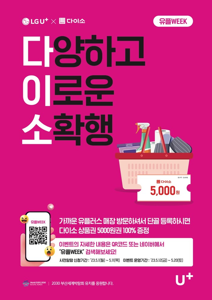 이번 이벤트는 5월 12일부터 20일까지 진행하며, 다이소 매장 내 ‘유플WEEK’ 이벤트 홍보물에 있는 QR코드를 통해 LG유플러스 매장 방문 일정을 예약 후 해당 날짜에 찾아가면 1인 1회 한정 다이소 모바일 상품권(5,000원) 1매를 증정한다. 사용하고 있는 통신사와 관계 없이 참여 가능하다.