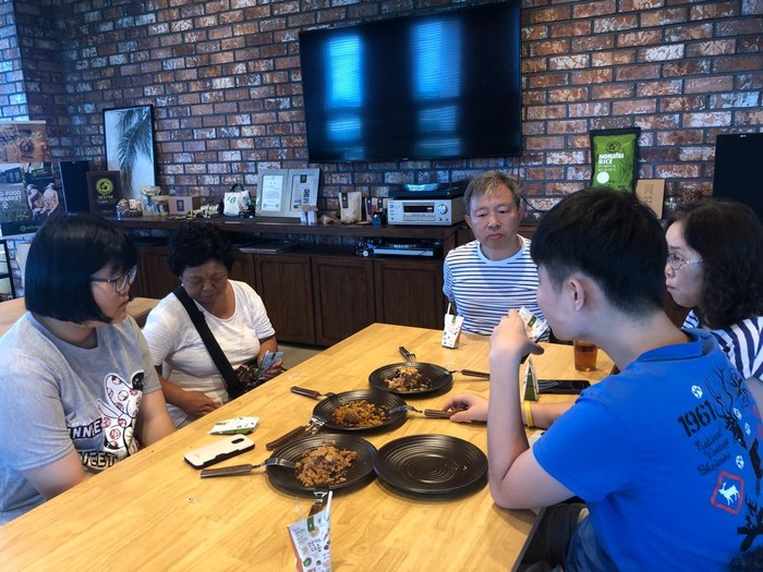 | ▲미듬영농조합에서 만든 쌀빵을 시식하며 이야기를 나누는 청소년들.(평택시 제공) |