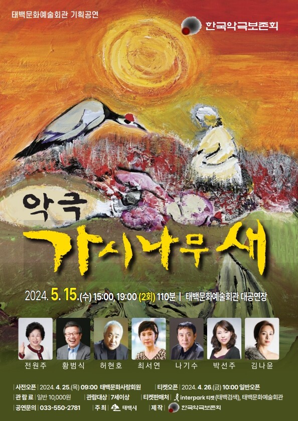 티켓은 전석 1만원으로 1인 6매까지 예매가 가능하다. 문화사랑회원은 이달 25일 오전 9시부터 할인가 7,000원으로 문화예술회관 사무실에서 현장 예매가 가능하며, 일반은 26일 오전 10시부터 인터파크예매(접속 후 ‘태백’으로 검색)와 현장예매가 가능하다.