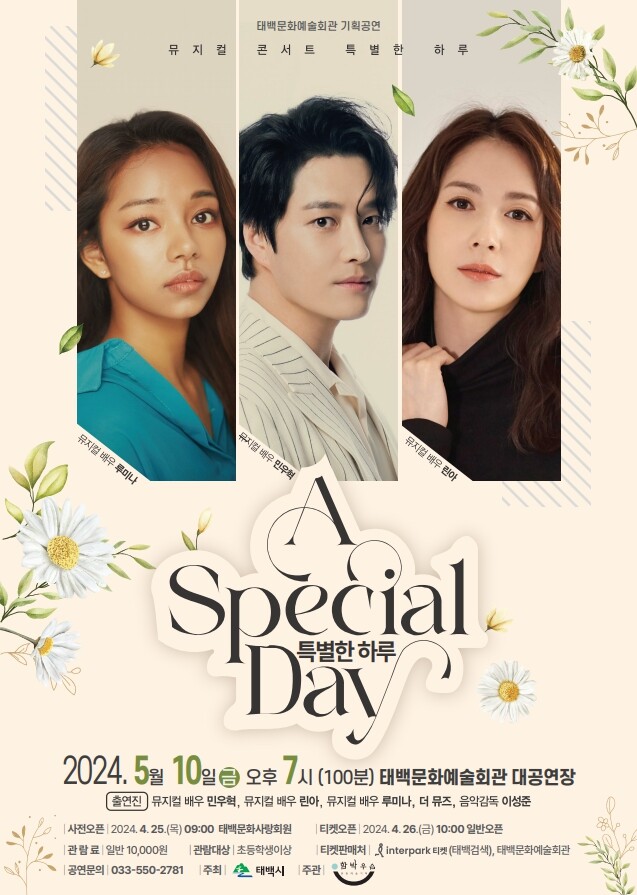 오는 5월 10일에 펼쳐지는 뮤지컬콘서트 ‘특별한 하루’에는 압도적 비주얼을 자랑함은 물론 연기력과 가창력을 인정받은 최고의 스타 민우혁과 인아, 루미나가 출연한다. 아울러 K-뮤지컬을 대표하는 음악감독 이성준이 편곡한 뮤지컬 레미제라블, 스위니토트, 지킬앤하이드, 영웅 등의 노래가 들려지게 된다.