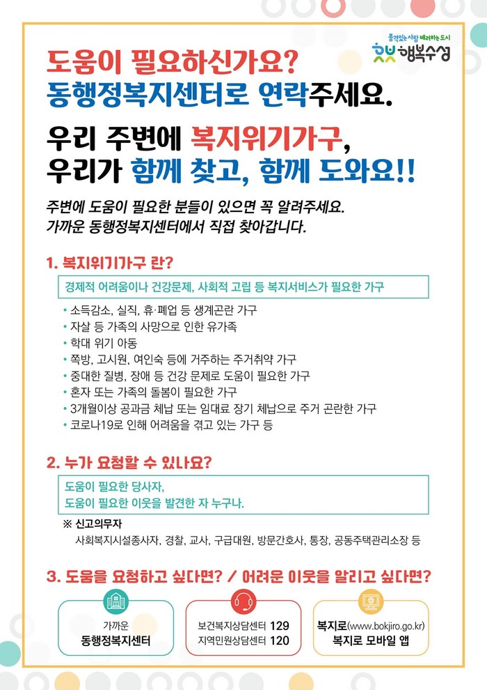 [로컬세계 박세환 기자]대구 수성구는 복지위기가구 발굴을 위한 안내문을 발송한다고 16일 밝혔다.
