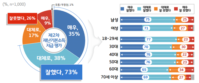 제2차 경기도 재난기본소득 지급에 대해 ‘잘했다’는 응답은 성, 연령, 직업 등과 상관없이 모두 절반을 넘었다.