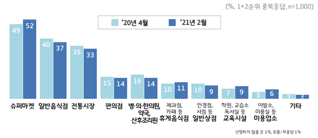 응답자들은 2차 재난기본소득을 슈퍼마켓(52%), 일반음식점(37%), 전통시장(33%) 등에서 사용할 계획이라고 답했다. 편의점(14%), 병·의·한의원, 약국, 산후조리원(14%) 순으로 높았다.(1순위, 2순위 중복응답)