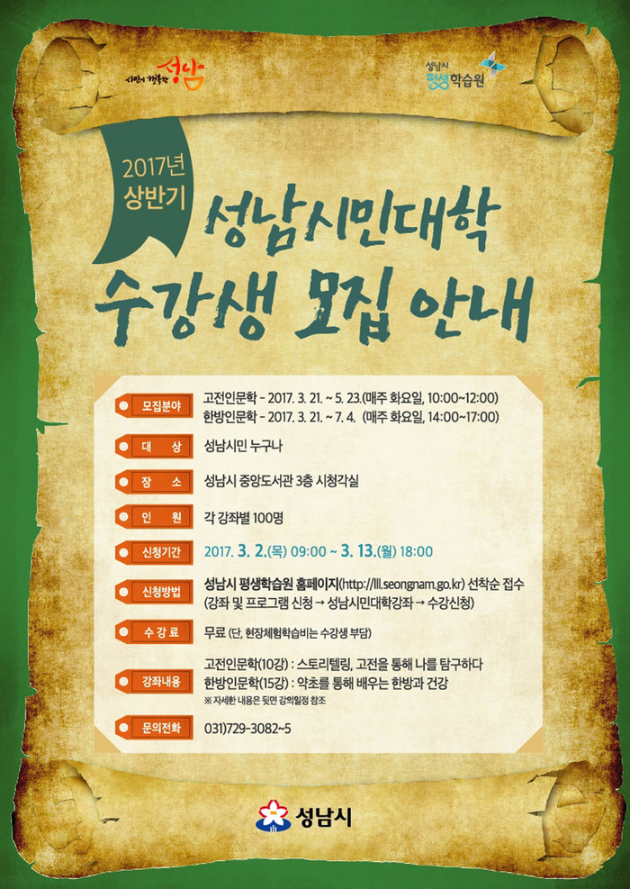 시민대학 강좌를 수강하려는 성남시민은 접수 기간 내 오전 9시~오후 6시 성남시 평생학습원 인터넷 홈페이지(http://lll.seongnam.go.kr)를 통해 선착순 신청하면 된다.