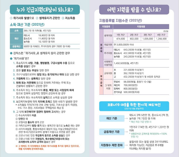 대상자로 선정되면 4인 가구 기준 생계비 126만6900원, 주거비 최대 64만3200원, 의료비(연 500만원 이내), 교육비 등을 지원받을 수 있다.
