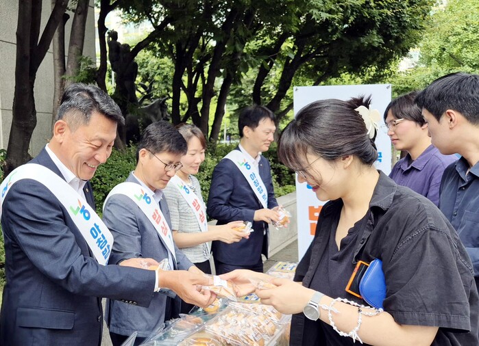 ▲농협중앙회 서울본부 김상수 본부장(왼쪽)이 쌀 소비 촉진을 위해 영업점 방문 고객에게 쌀로 만든 빵을 나눠주고 있다. 농협 제공 |