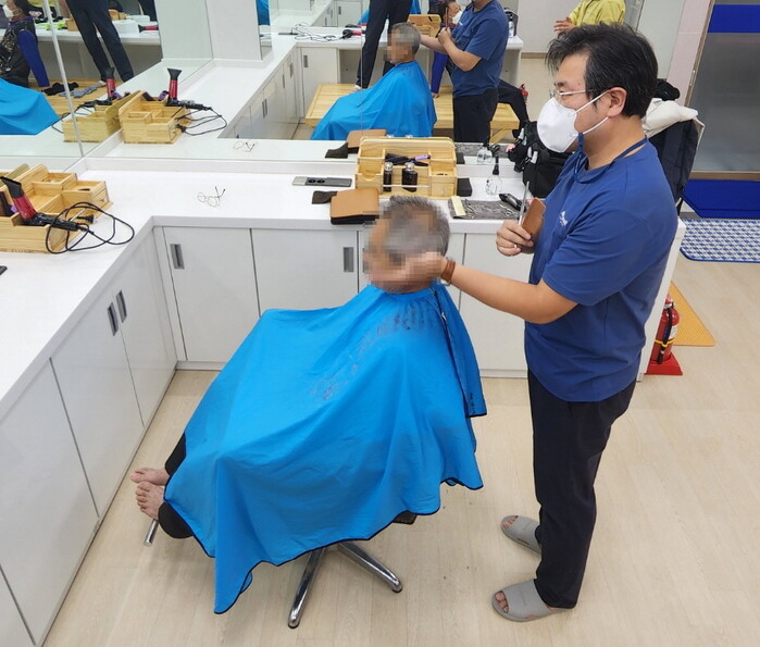 ▲ 기장군 정관읍복지회관은 11일 봉사자의 재능기부를 통해 지역민 12명에게 무료 이발를 제공했다. |
