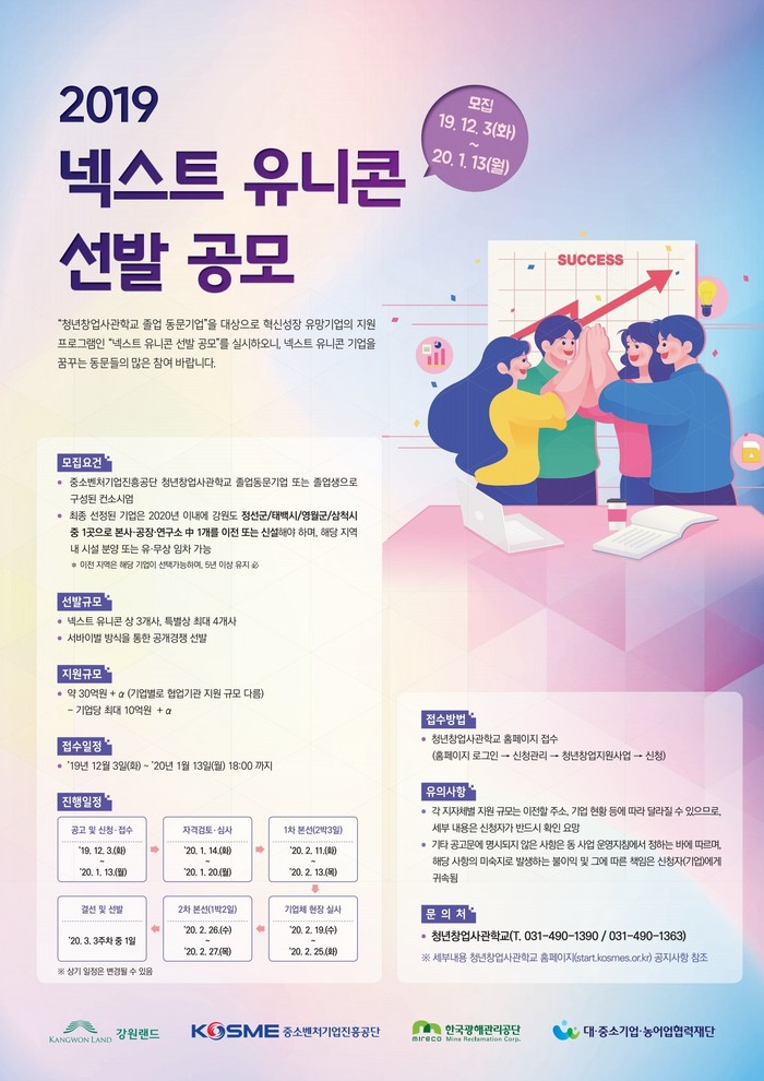 모집대상은 중소벤처기업진흥공단 청년창업사관학교 졸업동문기업 또는 졸업생으로 구성된 컨소시엄으로, 최종 선정된 기업들은 2020년 이내에 강원도 폐광지역(정선·태백·영월·삼척)으로 본사, 공장, 연구소 중 1개를 이전 또는 신설해야 한다.
