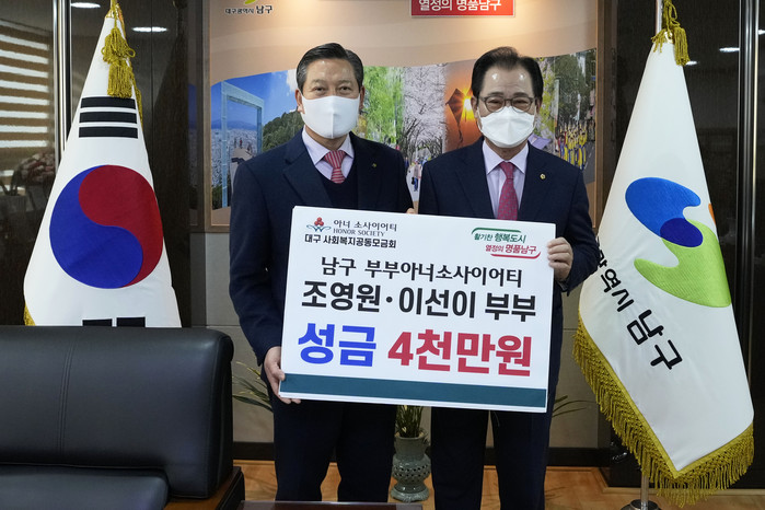[로컬세계 박세환 기자]대구 남구청(구청장 조재구)은 지난 10일, 조영원·이선이 부부(대구 남구 부부아너소사이어티)가 어려운 이웃을 위해 성금 4000만원을 기탁했다고 12일 밝혔다.