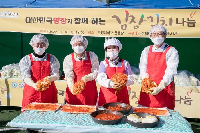 이날 행사는 군장대총장과 대학관계자 60여 명과 군산시장, 정길수 시의장이 참석한 가운데 대한민국 김치 명장(名匠)으로 알려진 김순자 씨가 직접 김장김치를 담그기를 시연했다. 이 자리에서 만들어진 김치는 시 지역아동센터 및 아동복지시설, 청소년 복지시설 등 62개소에 100통(1,000kg)을 전달됐다.
